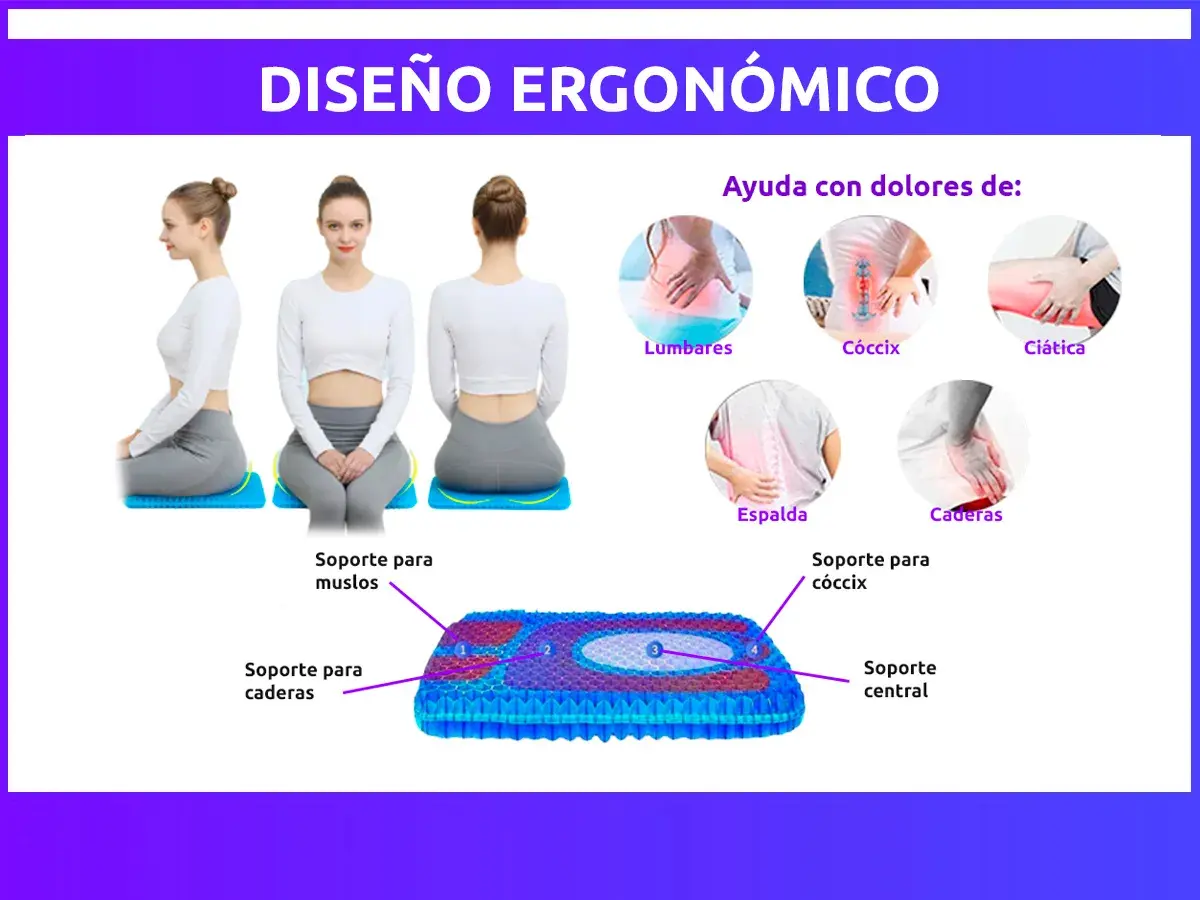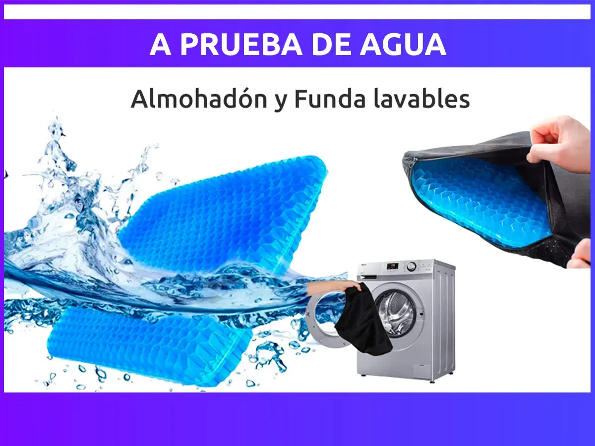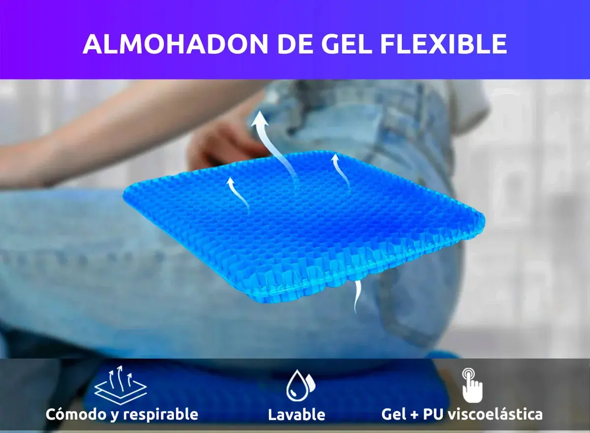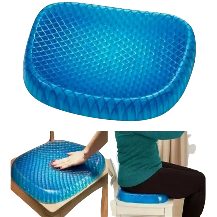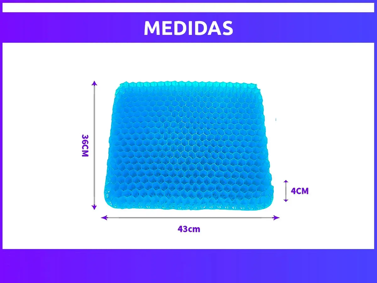Asiento portátil de gel de silicona, súper elástico y resistente. No se deforma, recupera su forma al 100% y brinda alivio inmediato del dolor de espalda y coxis. Su diseño panal permite mayor ventilación, evitando calor y sudor. Antideslizante, impermeable y fácil de lavar.