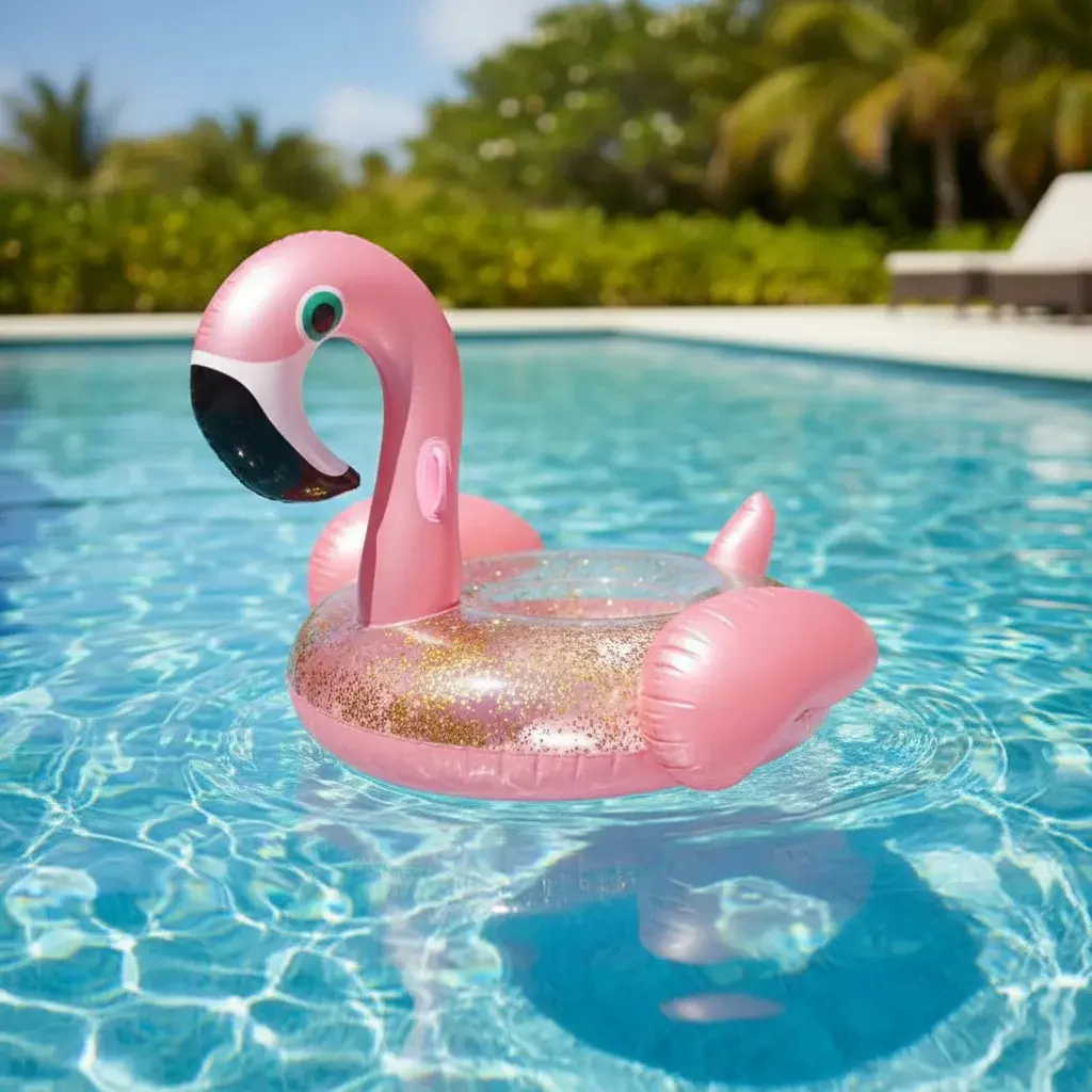 Ya sea para un día de relax o una fiesta en la piscina, el Inflable Glitter Flamenco será el centro de atención.