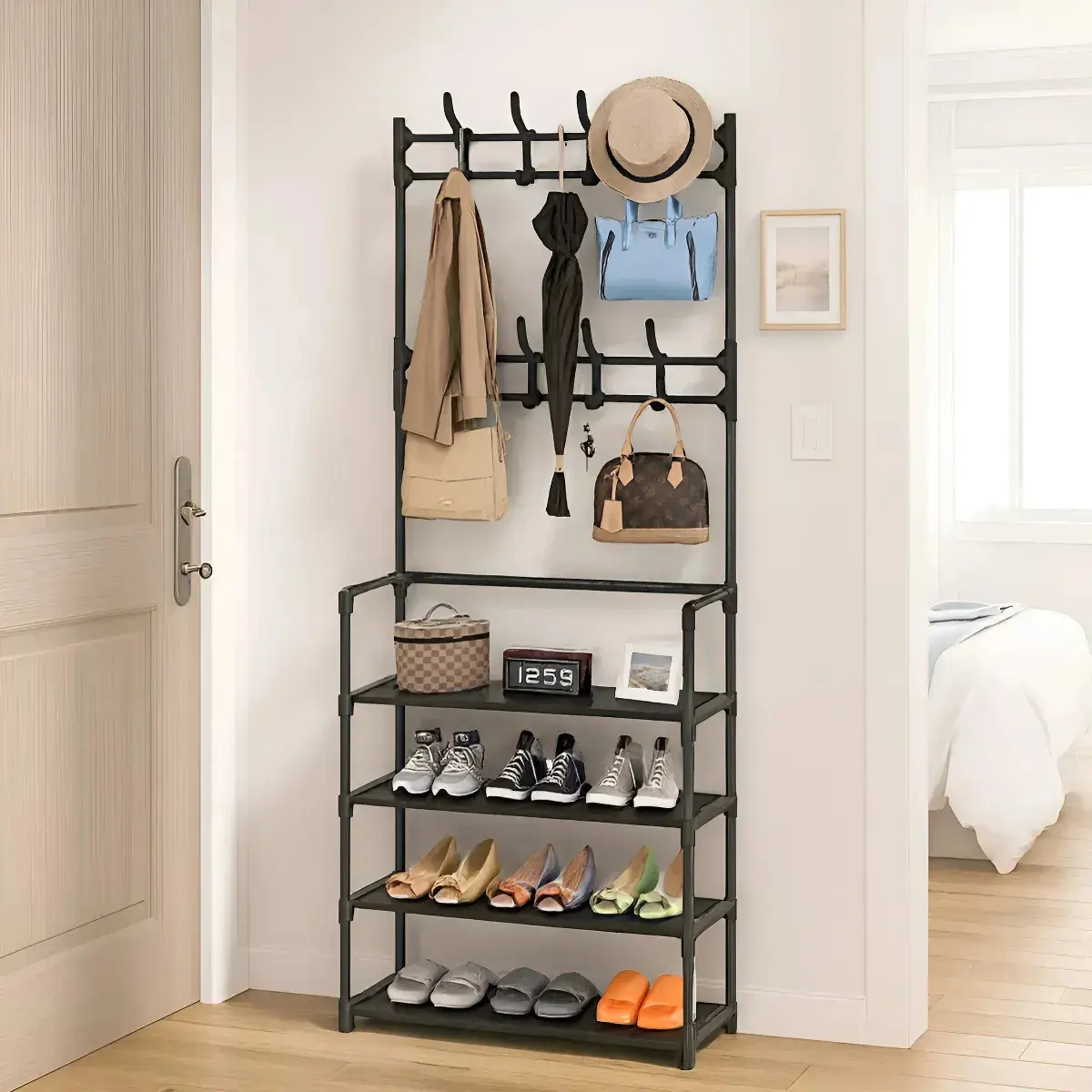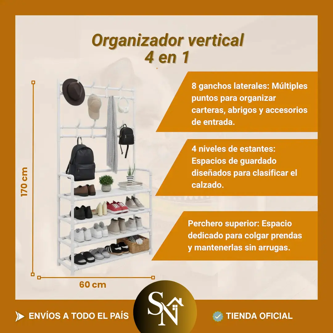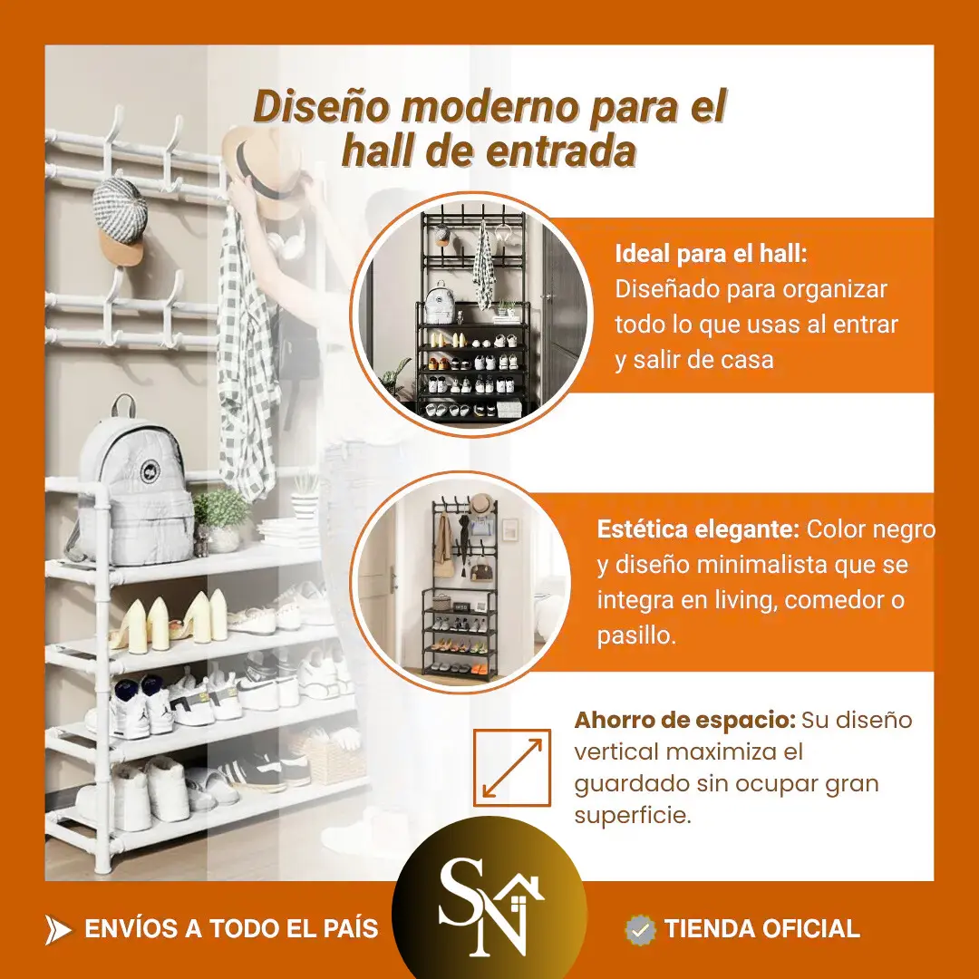 El diseño incluye 4 niveles y 8 ganchos, ofreciendo un amplio espacio para almacenar calzado y accesorios como abrigos y carteras. Fabricado en acero, garantiza durabilidad y resistencia, mientras que su peso ligero de 0,6 kg facilita su movilidad.